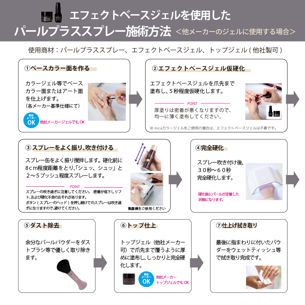 エフェクトベースジェル塗布後、5秒仮硬化→スプレー吹き付け→30~60秒ライトでしっかり硬化→トップコートでしっかり密着します。